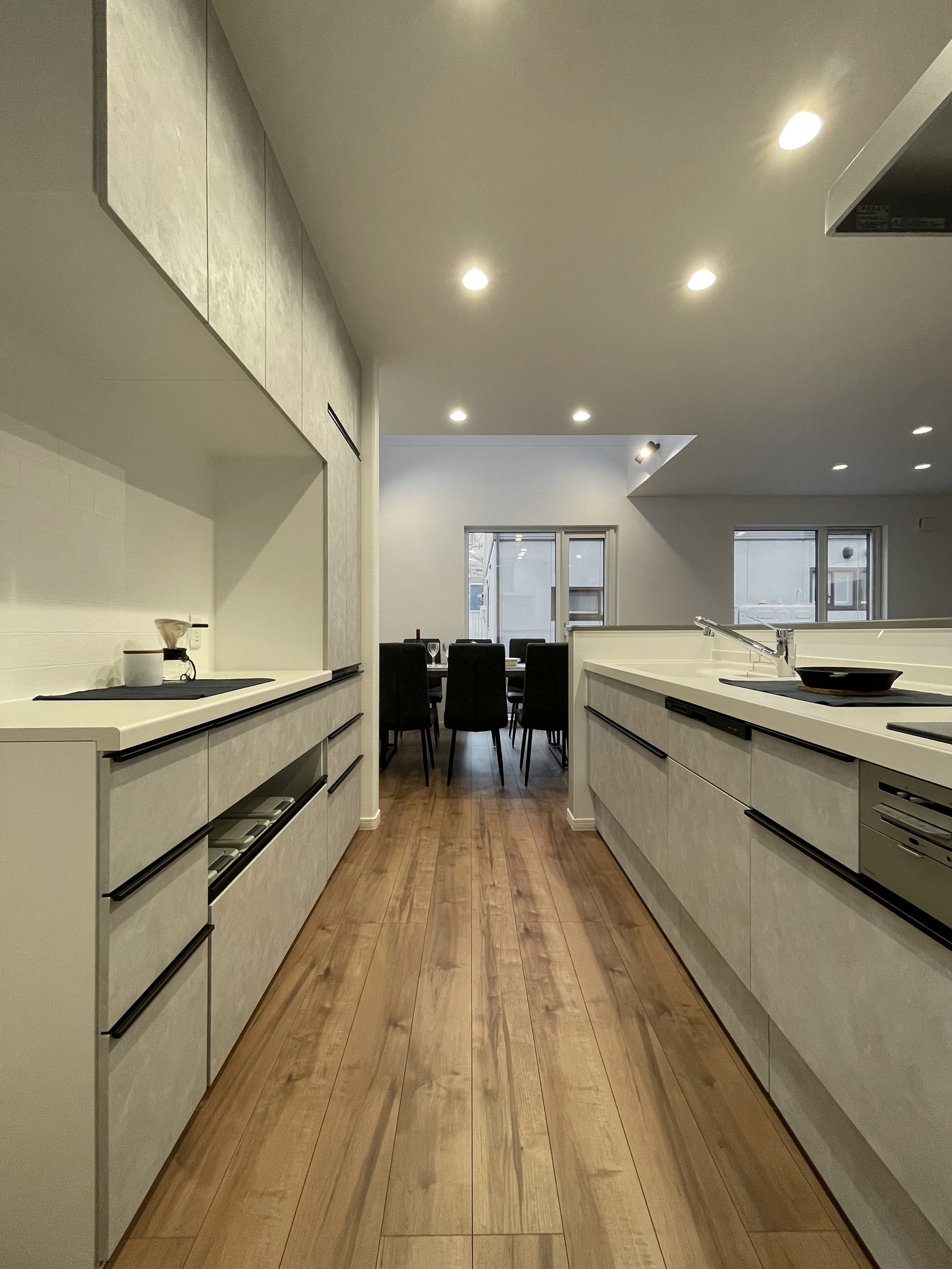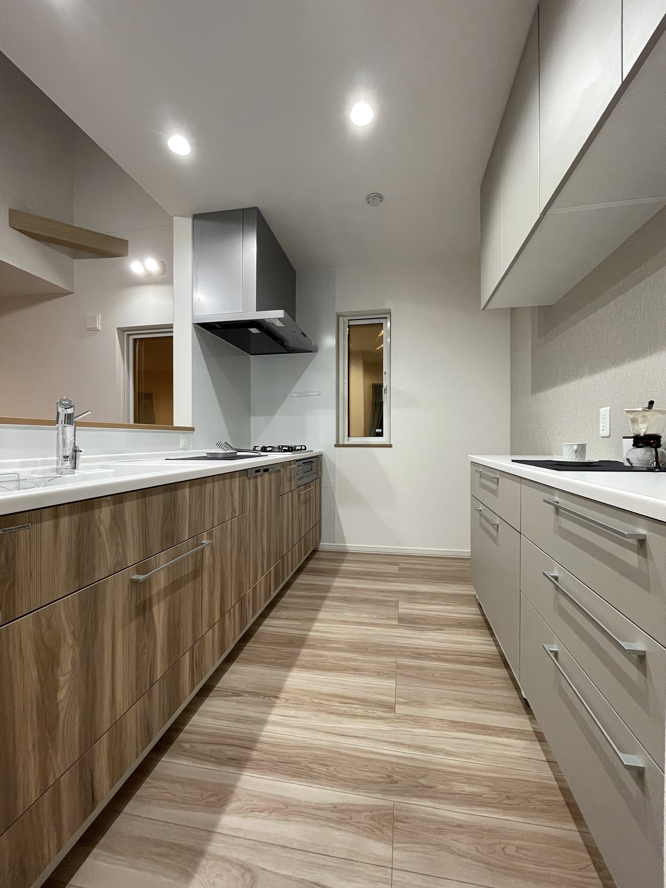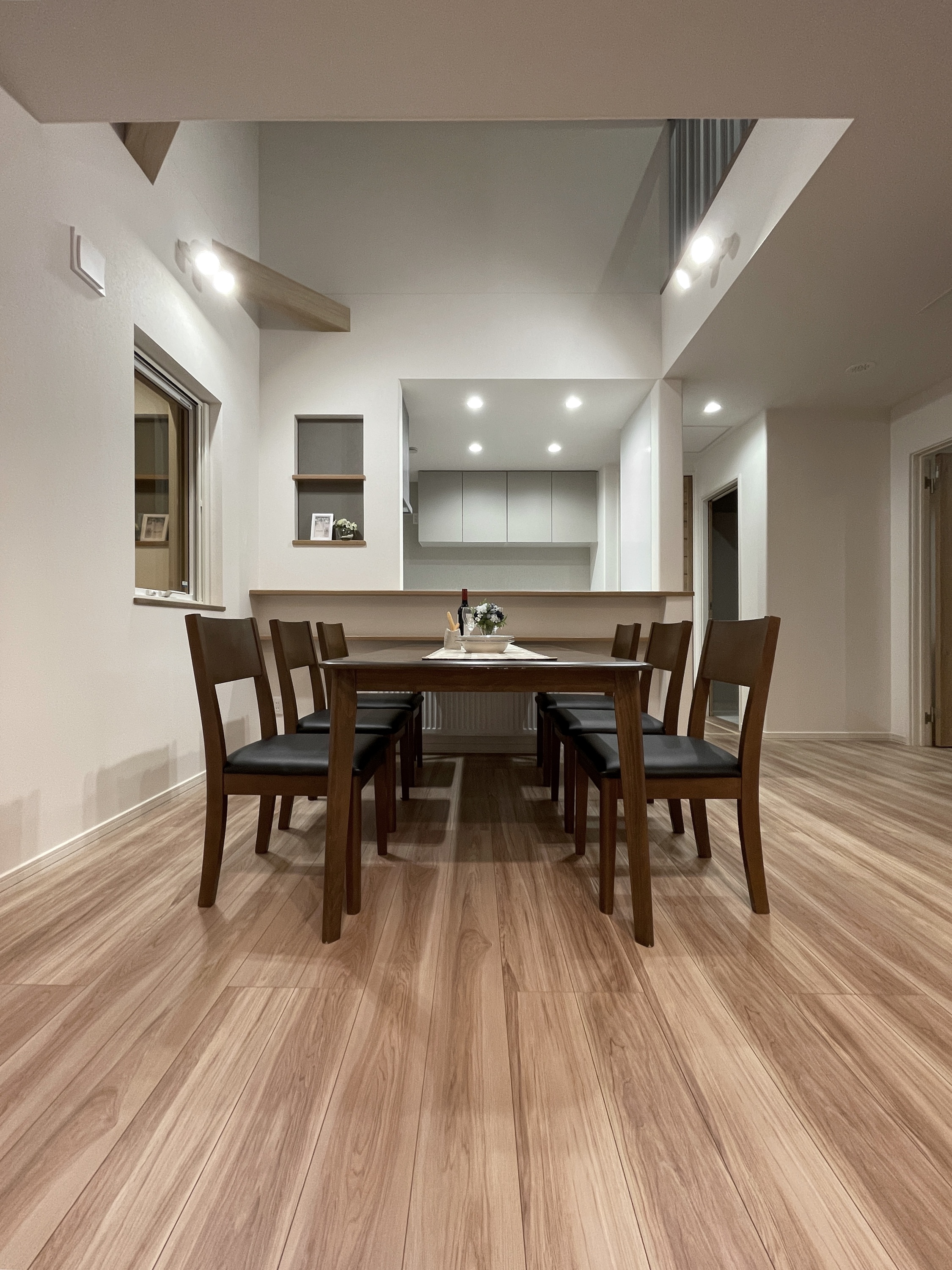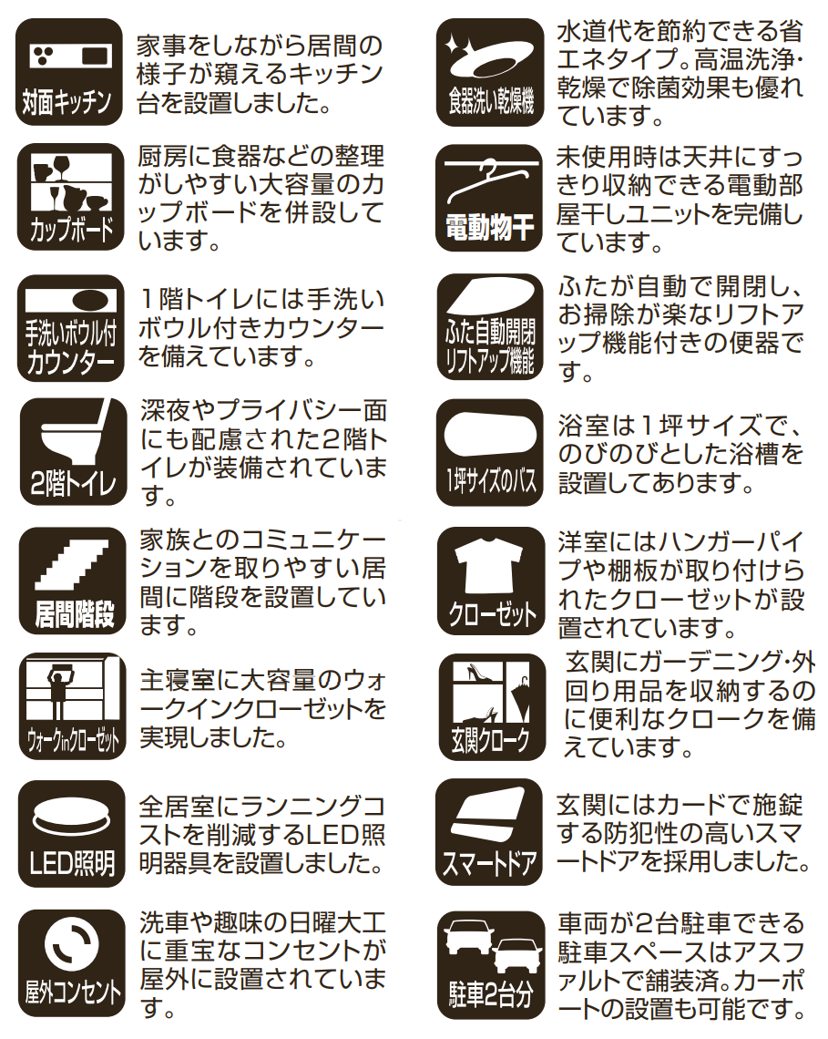 ■特徴・デザイン・間取り…木目の風合を感じる淡いブラウンの床材に、オフホワイトのクロスや建具を合わせ、すっきりと洗練された印象のインテリアに設えました。開放的な吹抜けからは穏やかな陽光が差し込み家族団欒の食卓が和みます。2台分の駐車スペースがアスファルト舗装されたオールインワン仕様。キッチンとリビング・ダイニングが一体化され家族の様子が窺える安心のレイアウト。玄関ホールやキッチンから洗面室につながる使い勝手の良い2wayの動線。二階ホールには天候や時間を問わず洗濯物を干すことのできる広いエキストラフロアを併設するなど、随所に工夫を感じる住まいです。