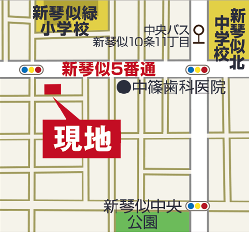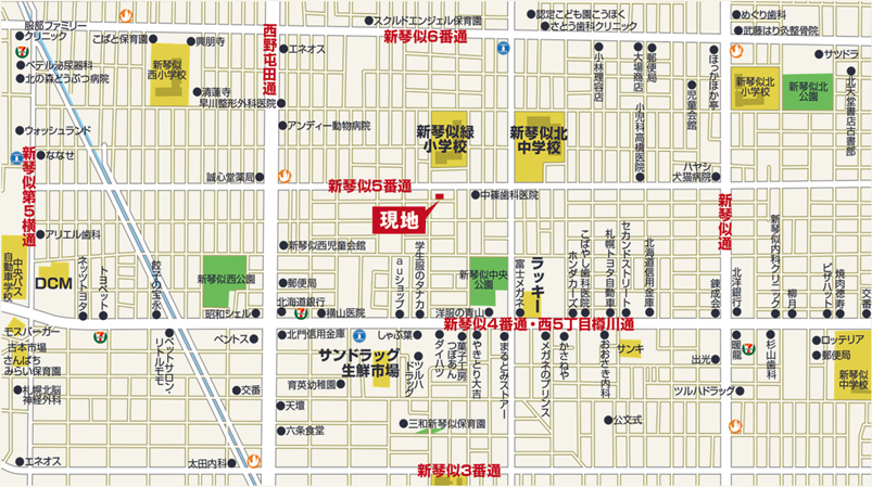 ■ロケーション…「西野屯田通」「新琴似5番通」「新琴似4番通・西5丁目樽川通」に近接し、ショッピング施設、医療施設、が生活圏に揃った好立地となっています。また、新琴似緑小学校、新琴似北中学校などの教育施設も近くお子様のいるご家庭にも安心の環境です。