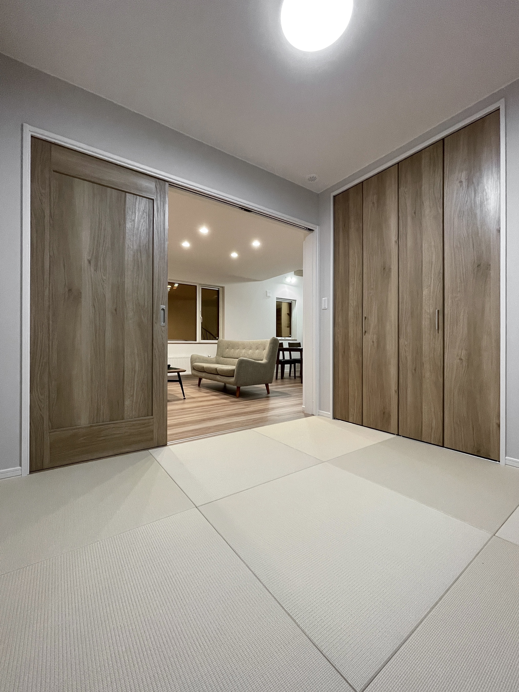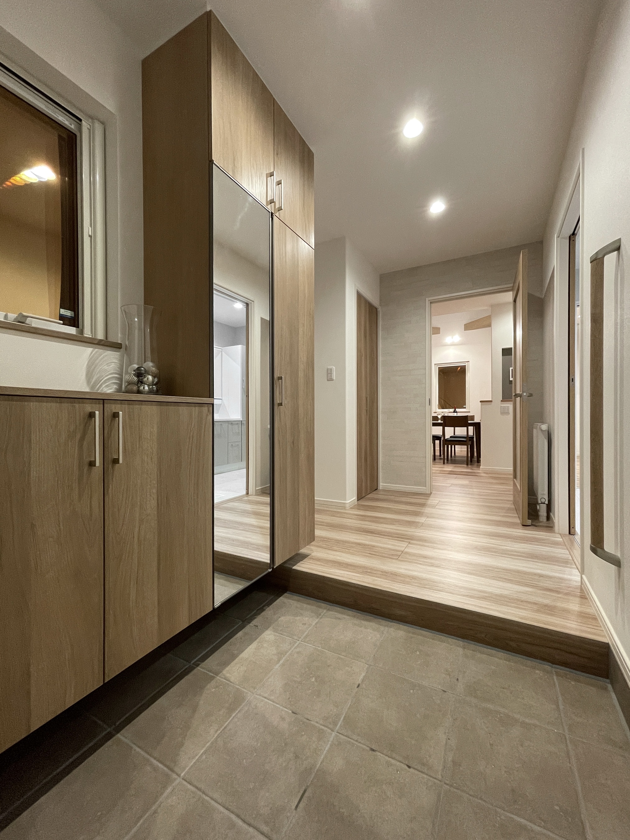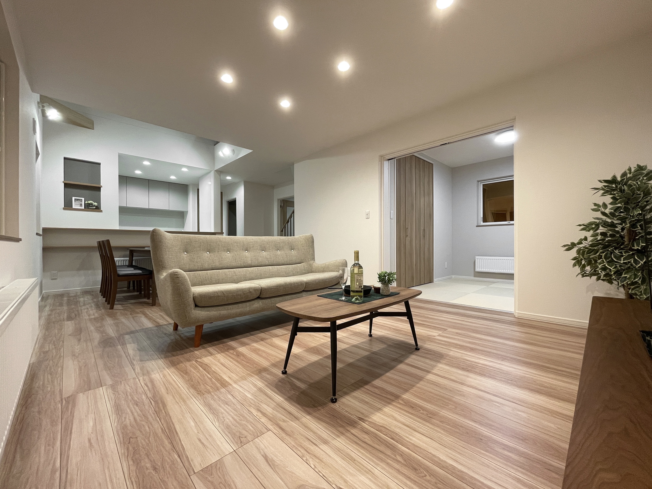 ■特徴・デザイン・間取り…居心地の良さを最優先に、オーク板の建具や床材の自然な趣と、ベージュや淡いグレーのクロスなどのコントラストで柔らかな印象に仕上げました。アスファルト舗装された車2台分の駐車スペースやエントランスまでのアプローチも施工済のオールインワン仕様。南面には雪の堆積スペースやガーデニングなどにも使える庭を確保。キッチンには保存食のストックや日常品などの保管に便利なパントリーを併設。二階の主寝室は3帖のウォークインクローゼット付きのゆとりのある広さ。ホールの天候を問わず洗濯物を干すことができるエキストラフロアに広い収納を配置するなど随所に使い勝手を考えた工夫を感じる住まいです。