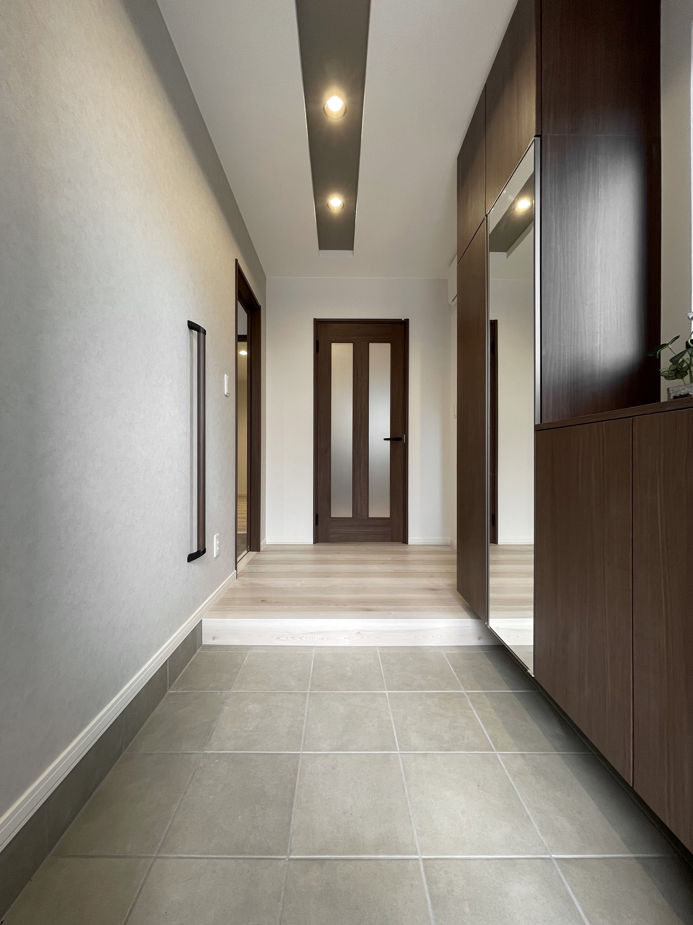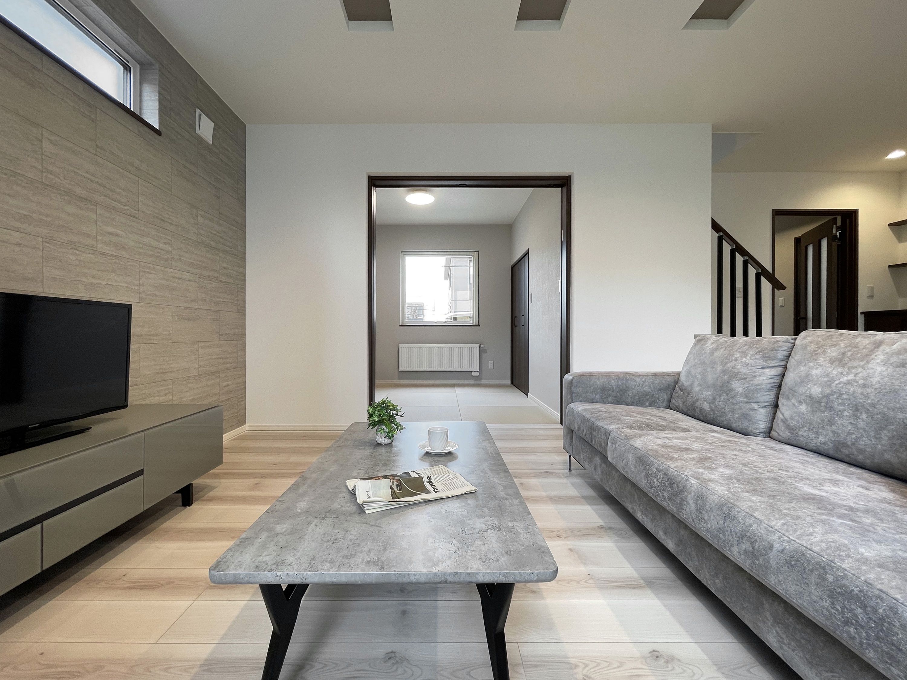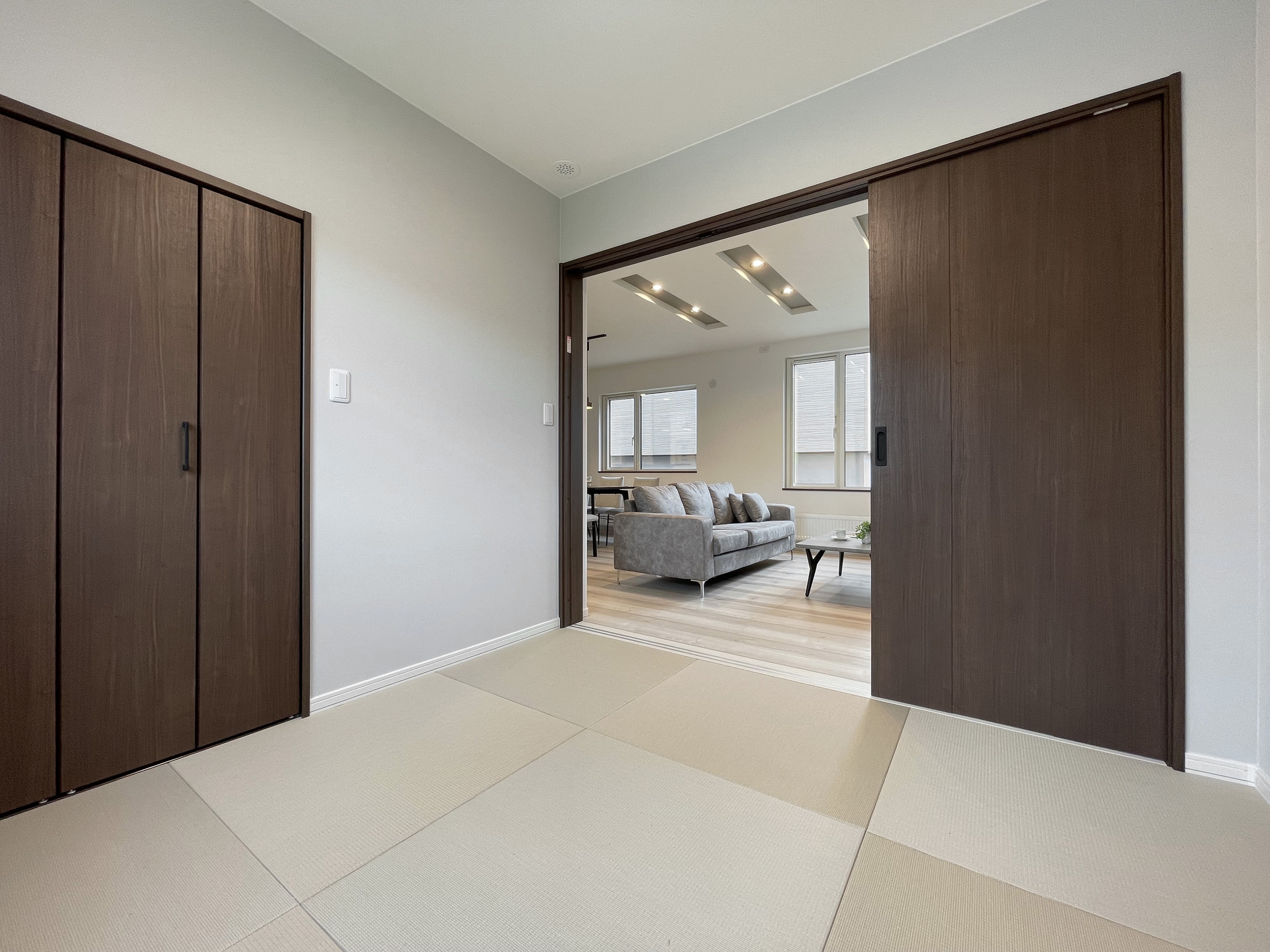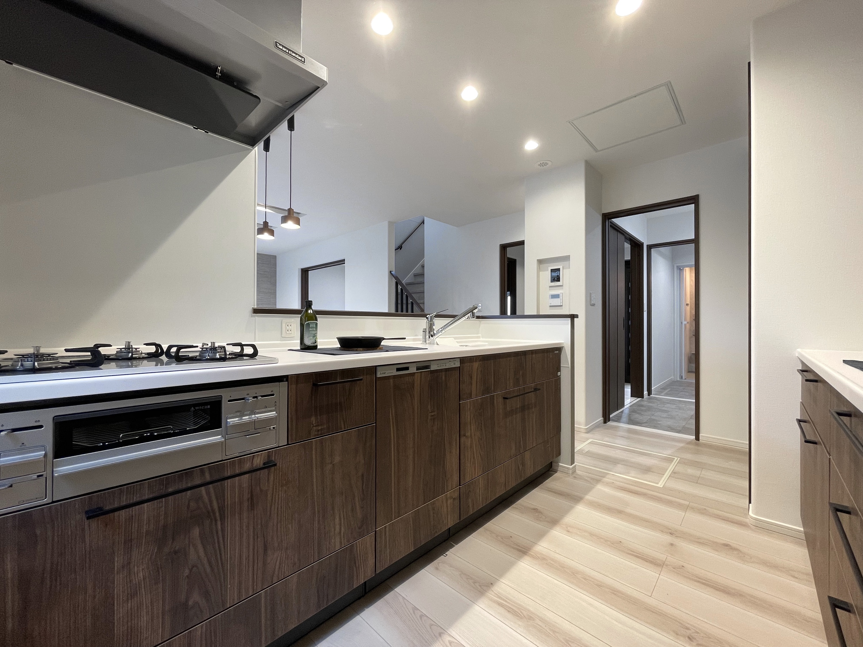 ■特徴・デザイン・間取り…ベージュ・ブラウン・アイボリーの淡い配色で明るくシックにまとめ、チャコールブラウンの建具やタイル調のアクセントクロスで色彩に抑揚をつけ、キッチンにディープグリーンの塗り壁調のクロスを印象的に設えました。アスファルト舗装を施した駐車スペースは、乗用車2台を駐車でき、インターロッキングブロックで玄関アプローチなどの外構も施工されたオールインワン仕様の住まいです。2wayで配置された洗面室と、洗濯室として便利なユーティリティーは独立させて区別化し、広く使いやすく確保されています。二階の6帖~9.5帖の各個室は階段ホールで干渉を緩和するよう隔てられ、昼夜、天候を気にする事なく洗濯物などを干せる半独立型のエキストラフロアも設けられています。