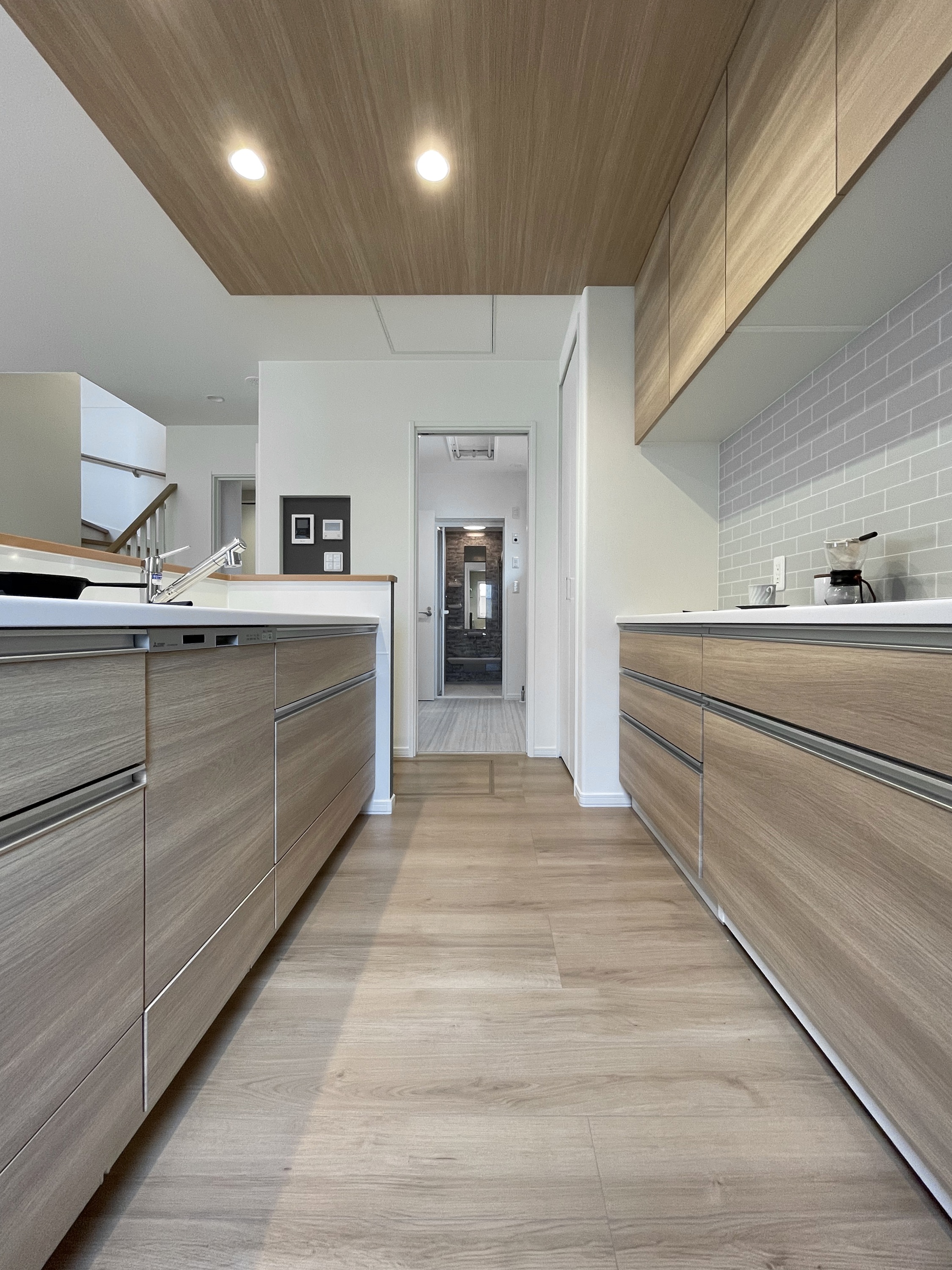 ■特徴・デザイン・間取り…白を基調とした、すっきりと温かみのあるインテリアに、オーク調の床材と洒脱なホワイトの建具を合わせ、エーゲブルーのデザインクロスをリビングの壁一面に大胆に設えるなど、印象的で趣のある意匠でまとめました。63.89坪の広い敷地。南東から南面へ大きく広がる日当りの良い庭。アスファルト舗装された車2台分の駐車スペース。玄関ポーチへと続くインターロッキングブロックのアプローチ。洗面室を介してキッチンへとつながる2wayの水廻り。一体化されたキッチン・ダイニング・リビングと共有できる和洋室。二階居室の棚など設置済みのウォークインクローゼット。天候に左右されず洗濯物干しなど汎用性のある広いエキストラフロア。玄関ホールにもコートなど収納できるクロークが設置されています。