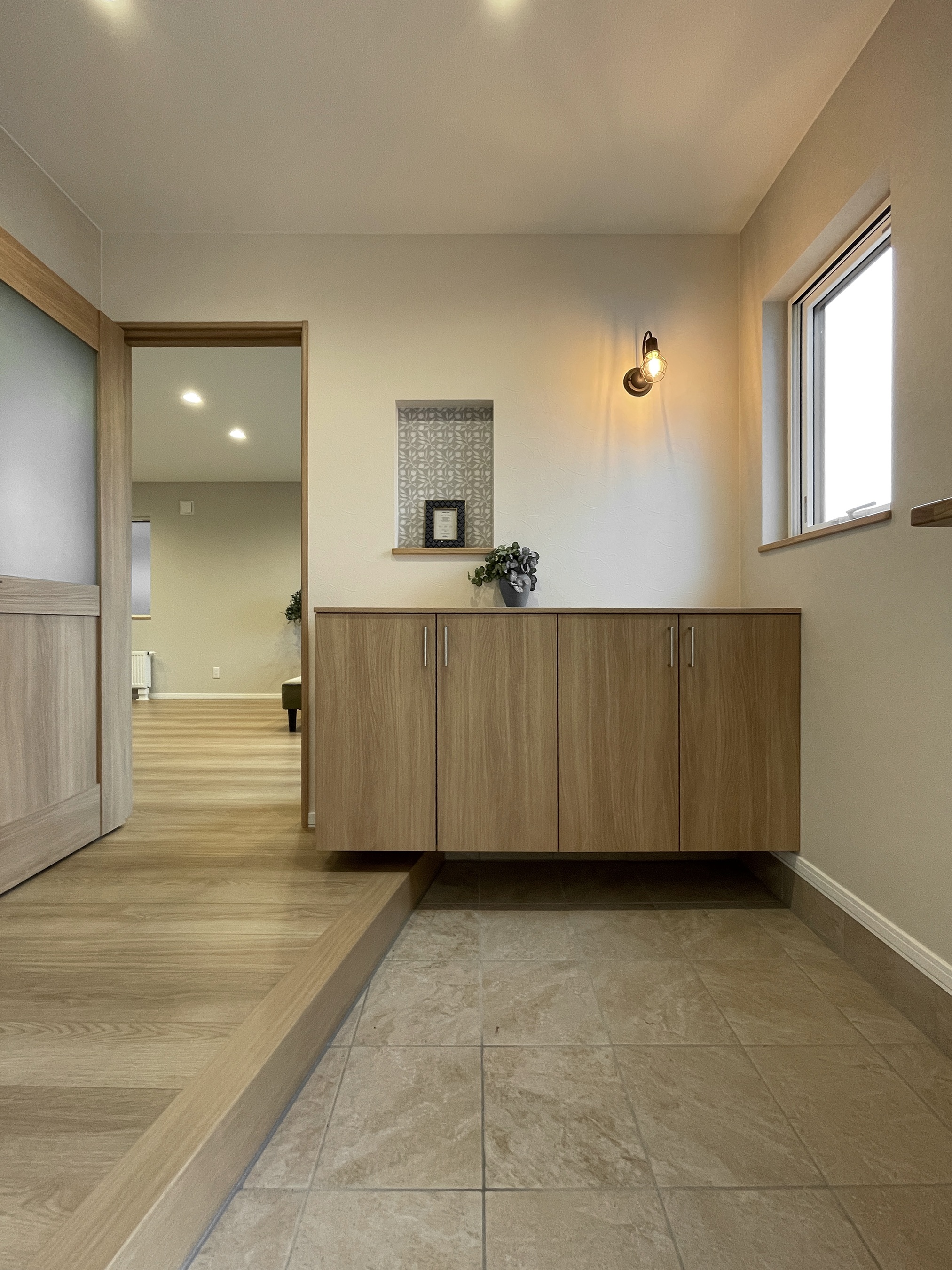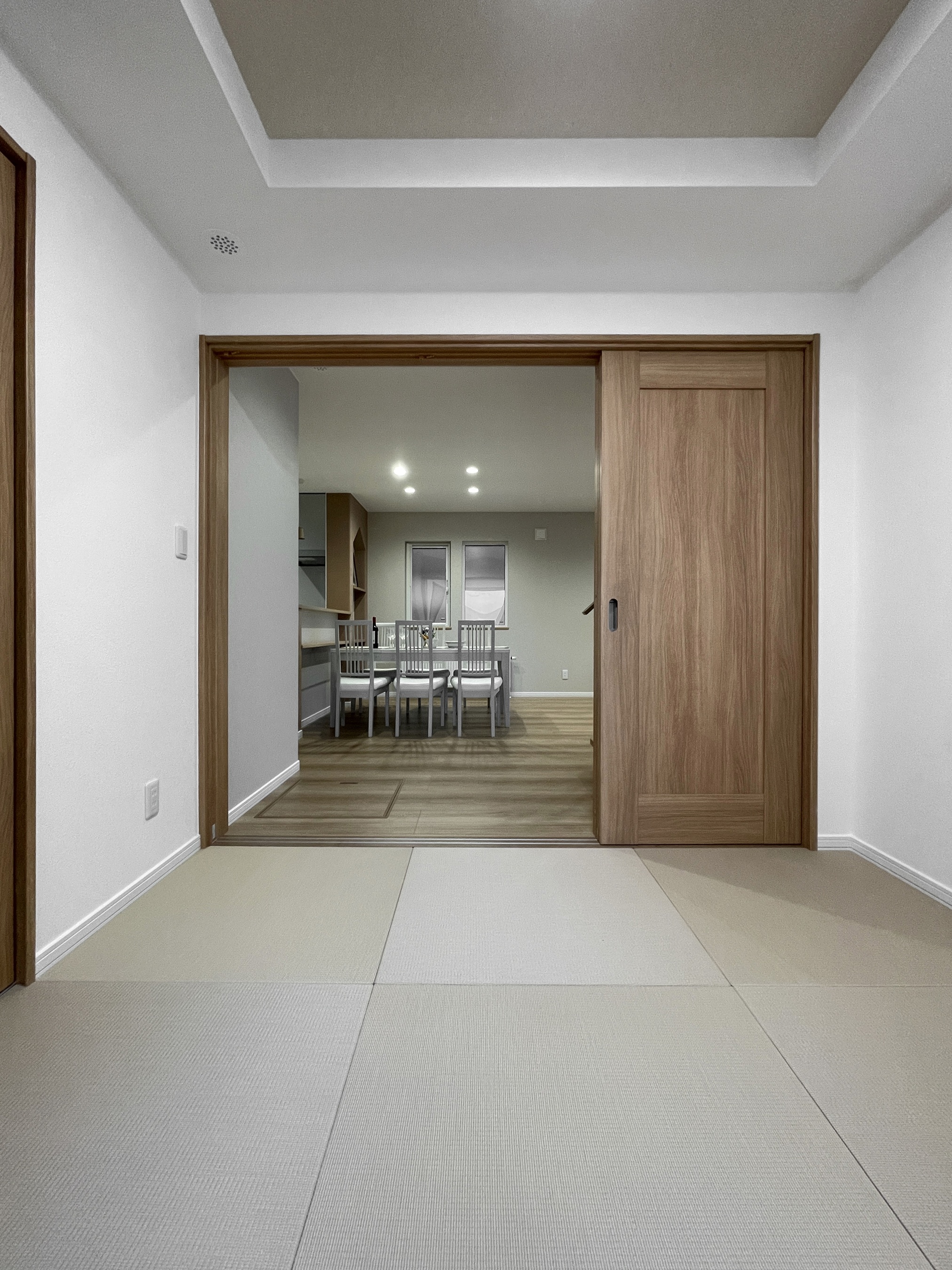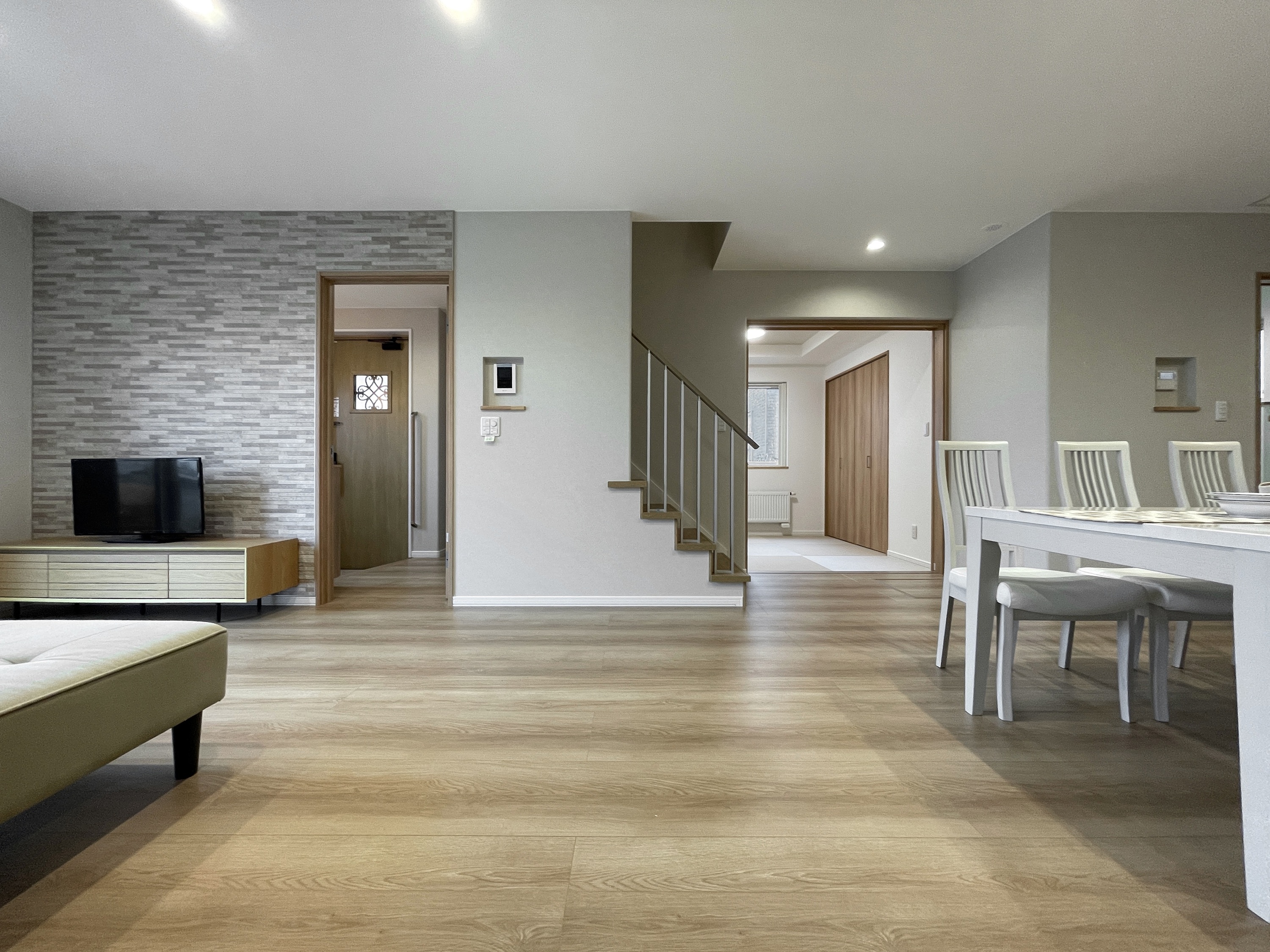 ■特徴・デザイン・間取り…居心地の良さを最優先に、オーク板の建具や床材の自然な趣と、ベージュや淡いグレーのクロスなどのコントラストで柔らかな印象に仕上げました。アスファルト舗装された車2台分の駐車スペースやエントランスまでのアプローチも施工済のオールインワン仕様。南面には雪の堆積スペースやガーデニングなどにも使える庭を確保。キッチンには保存食のストックや日常品などの保管に便利なパントリーを併設。二階の主寝室は3帖のウォークインクローゼット付きのゆとりのある広さ。ホールの天候を問わず洗濯物を干すことができるエキストラフロアに広い収納を配置するなど随所に使い勝手を考えた工夫を感じる住まいです。