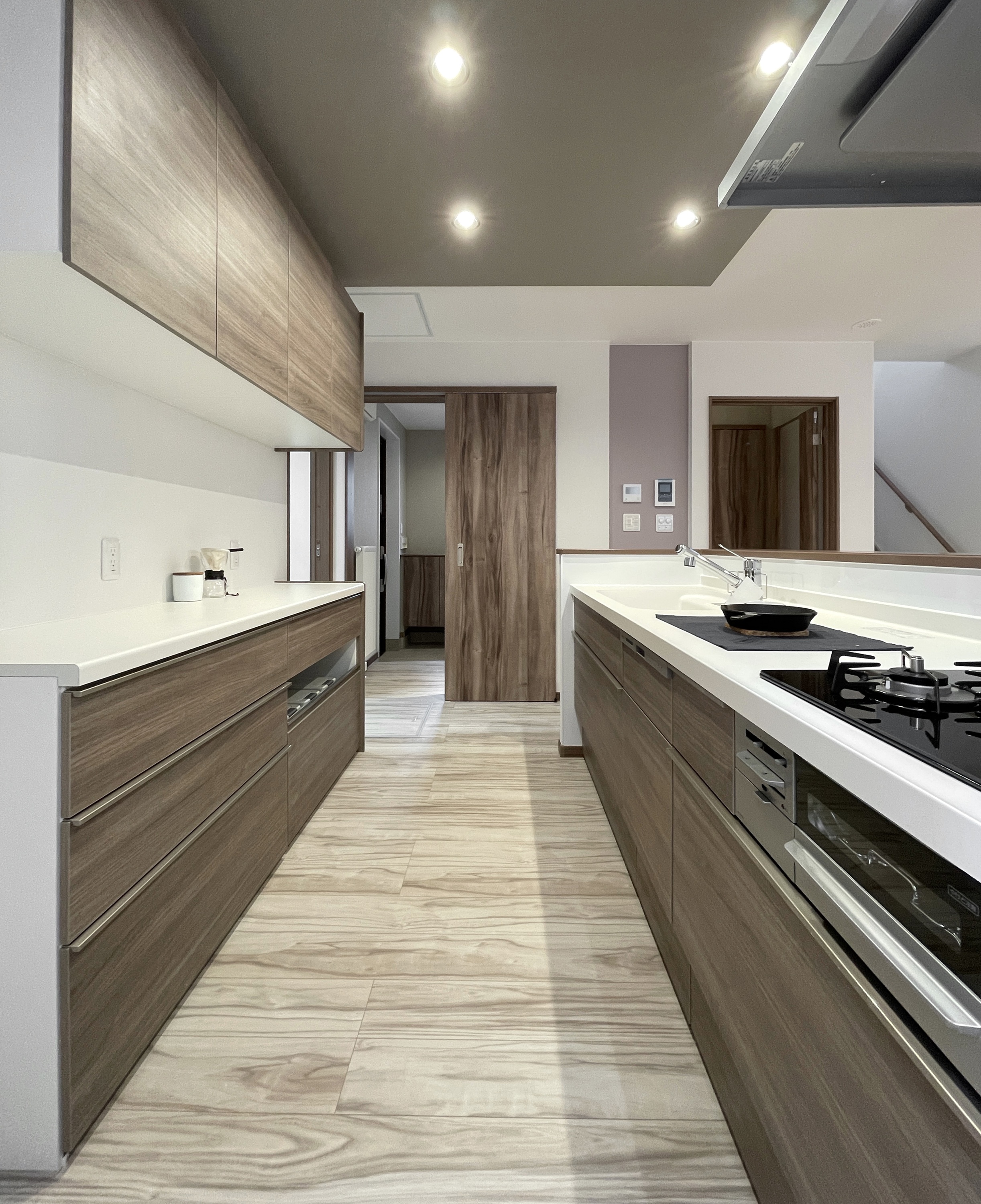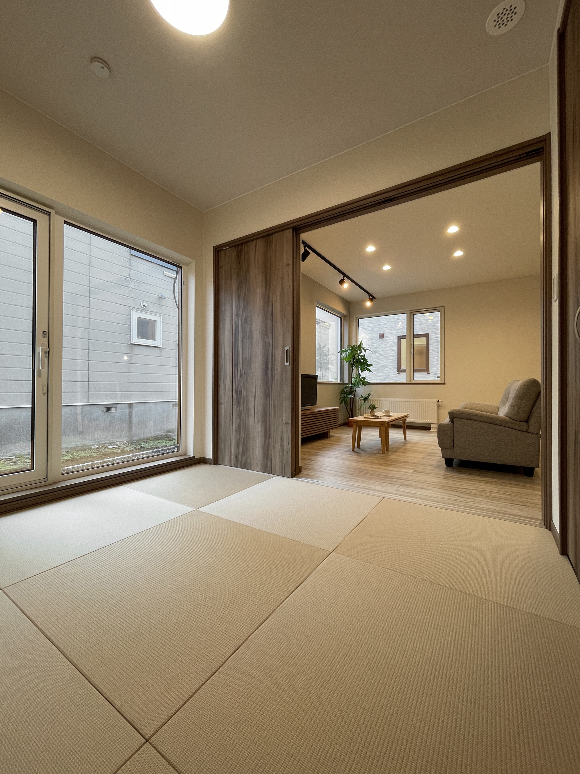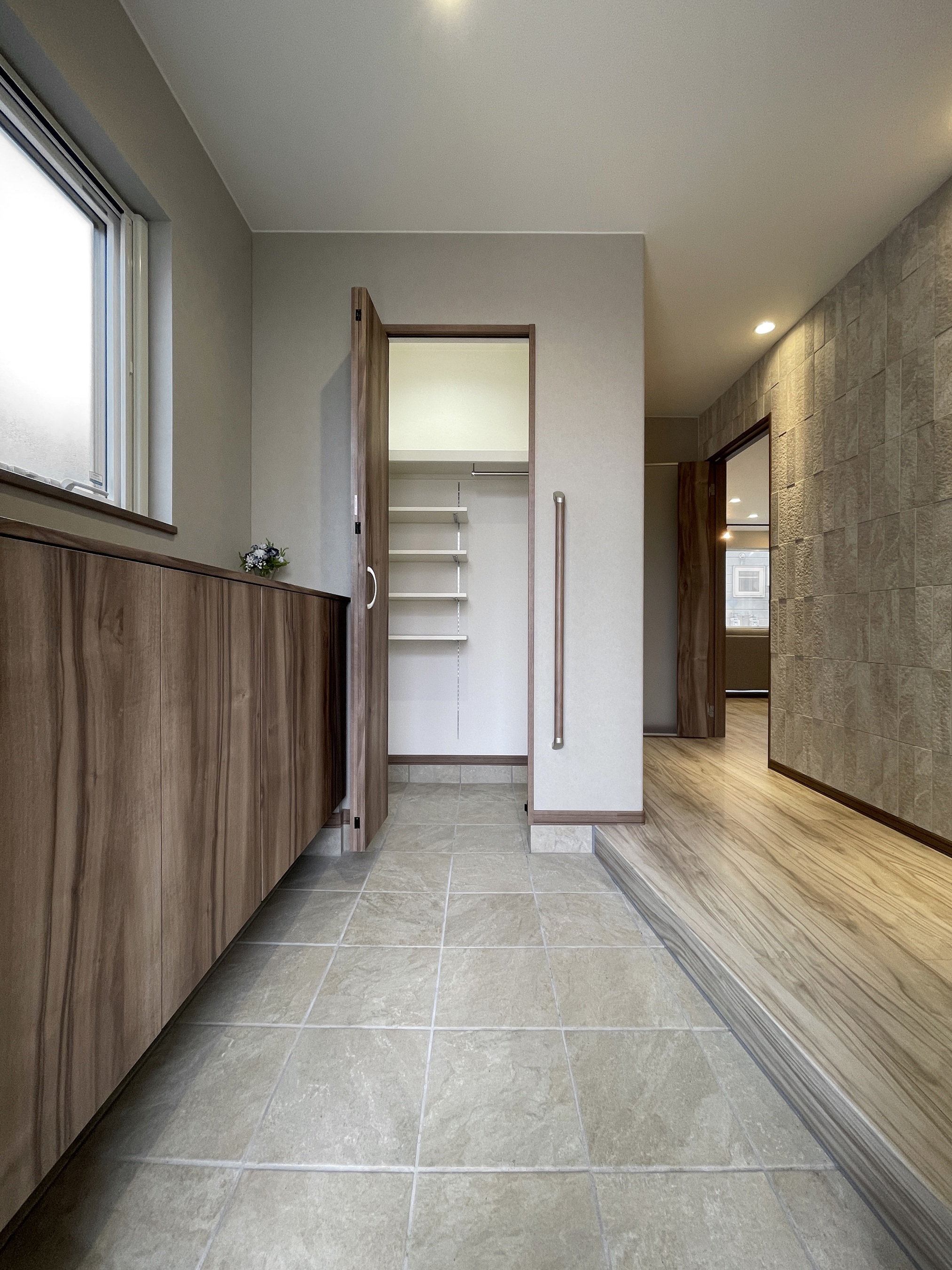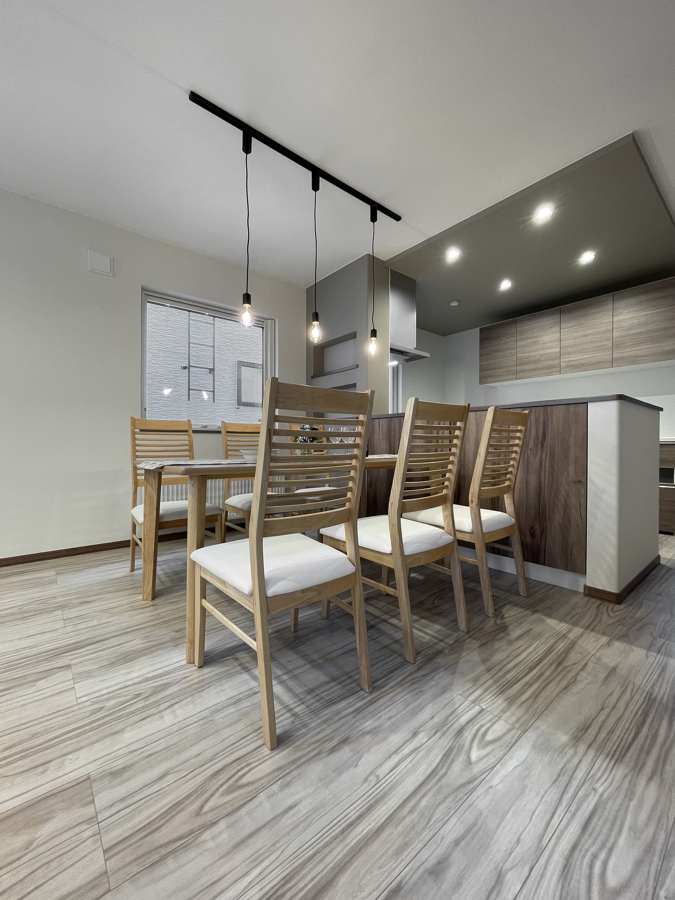 ■特徴・デザイン・間取り…流れるような木目のフロアにダークブラウンの建具を合わせ、細部までデザイン性に拘った内装です。乗用車2台分の駐車スペースはアスファルト舗装されたオールインワン仕様。玄関には土間続きのベビーカーなどの収納に重宝するストレージを併設。キッチンから家族の様子が窺えリビング・ダイニング・洋室と一体化した安心のレイアウト。二階のゆとりのある広さの10帖の主寝室は4帖のウォークインクローゼット付き。階段ホールには天候問わず洗濯物を干すことのできるエキストラフロアを配置するなど暮らしやすさを追求した住まいです。