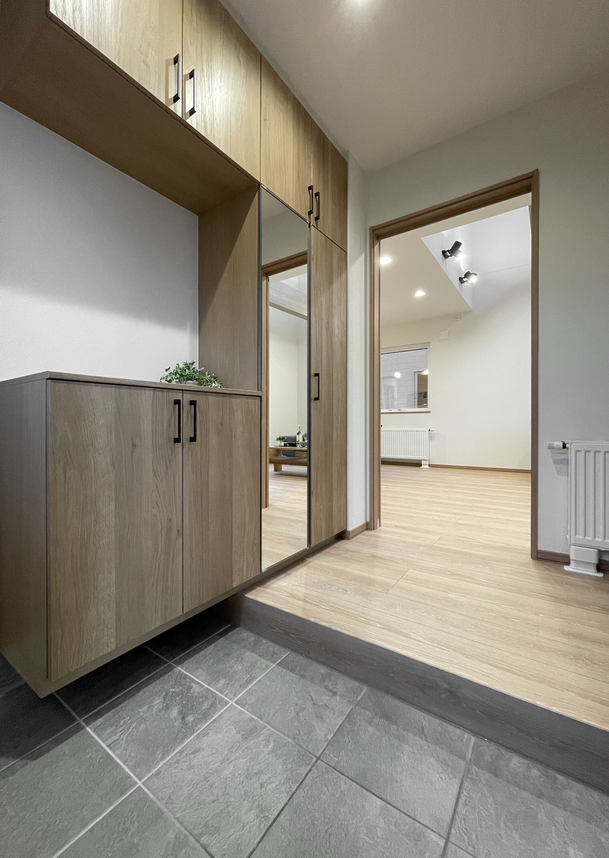 開放感のある間取りを生かし、壁材の奥深さやデザイン性のある吹抜けの演出で、明るく印象的なインテリアになっています。アスファルト舗装された2台分の駐車スペースの他はエントランスまでのアプローチもインターロッキングで施工済みのオールインワン仕様。玄関には土間続きの広いストレージを確保。キッチンには保存食のストックや日常品などの保管に便利なパントリーを併設するなど随所に収納を多く確保しました。また、熱効率を考慮しシーリングファンのついた開放的な吹抜けからは明るい陽光が差し込みます。