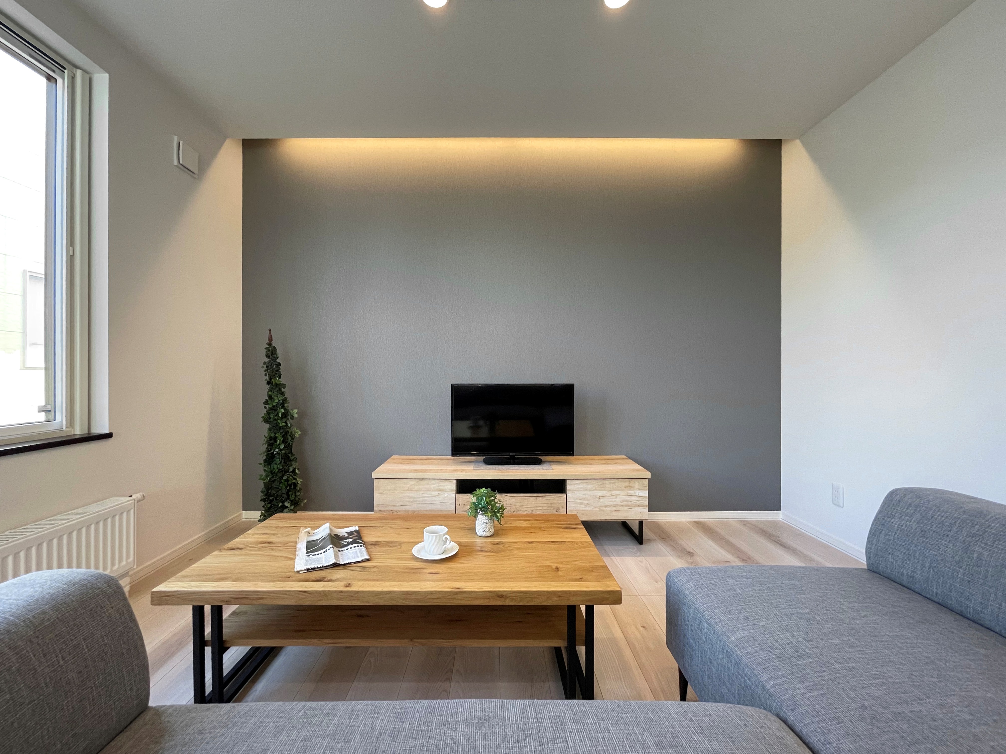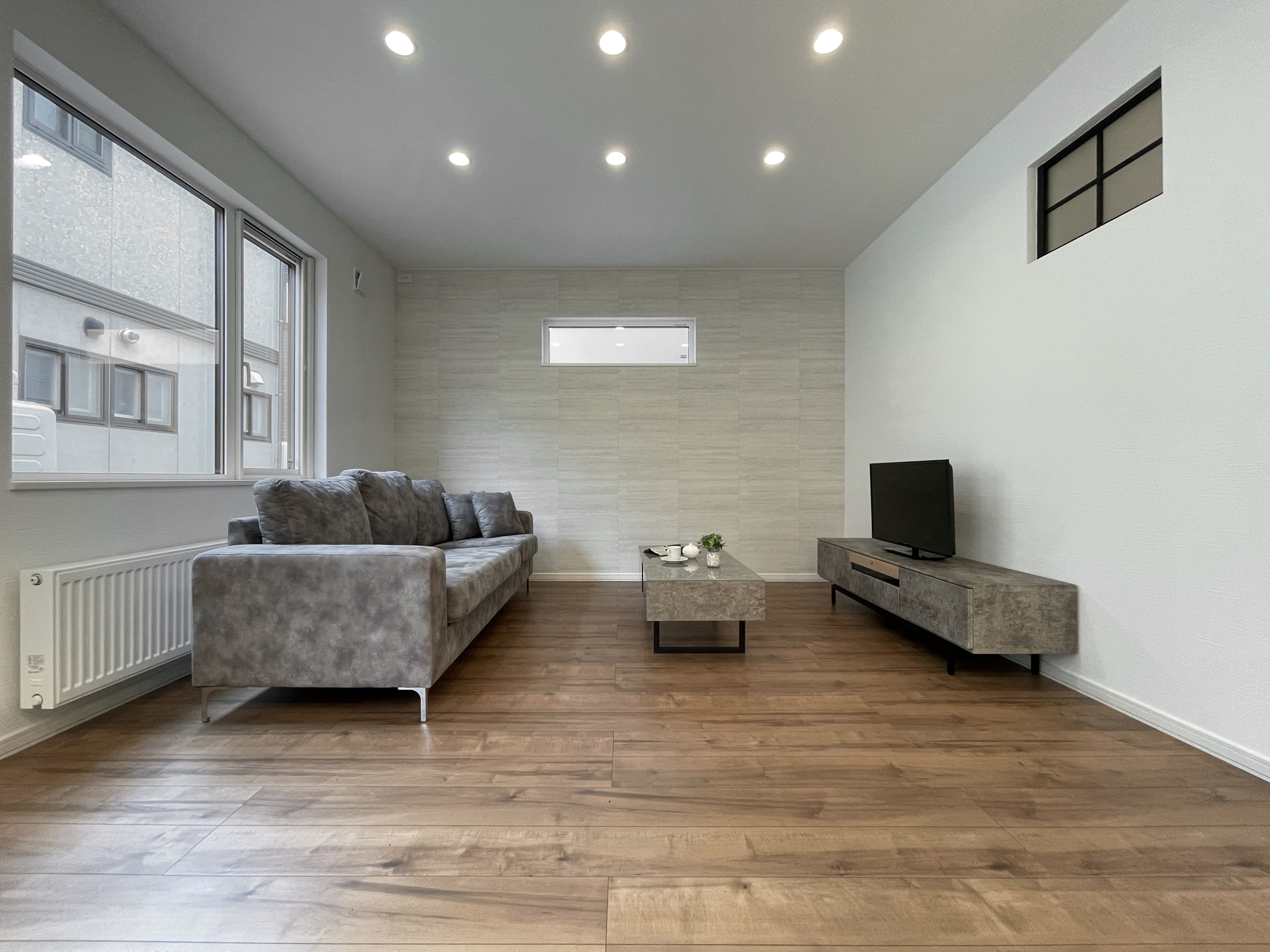 ■特徴・デザイン・間取り…テレビ設置スペースの壁一面に潚洒なグレーのクロスを張り、間接照明の光と相俟った陰影が印象的です。南面に開放的な窓を取入れ陽光がリビング・ダイニング、キッチンへと差し込む明るく和む住まいになっています。アスファルトが舗装された駐車スペースは乗用車が2台分駐車可能で、玄関前のアプローチなどの外構まで施工されたオールインワン仕様です。玄関には土間続きのストレージを併設し、冬期の除雪用具や外回り清掃用品などの収納に便利です。キッチンとリビングは2wayで繋がり、ストレスのない動線で洗面室はゆったりと使用できるよう広くレイアウトされています。一階はリビング・ダイニング・キッチン、そして水廻りなどの日常の暮らしに欠かせない生活フロアを配置し二階は階段ホールを介して干渉し合わないように個室を4室確保するなどプライバシーと使い分けを明確にした間取りになっています。